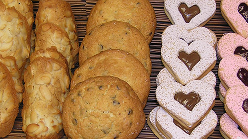 If you love Cookies, then try our Almond Tuile, Cinnamon Swirl, Chocolate Chip Cookies, Raspberry Hearts, Raisin Cookies, Coconut Macaroons, and Butter Cookies dipped in Chocolate.